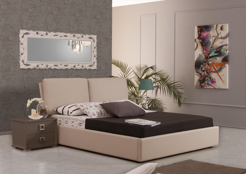 Letto con contenitore imbottito in ecopelle o tessuto a scelta con rete a doghe, ammortizzatori con pistoni 1000n con fondo in truciolare da 8mm rivestito in tnt nero